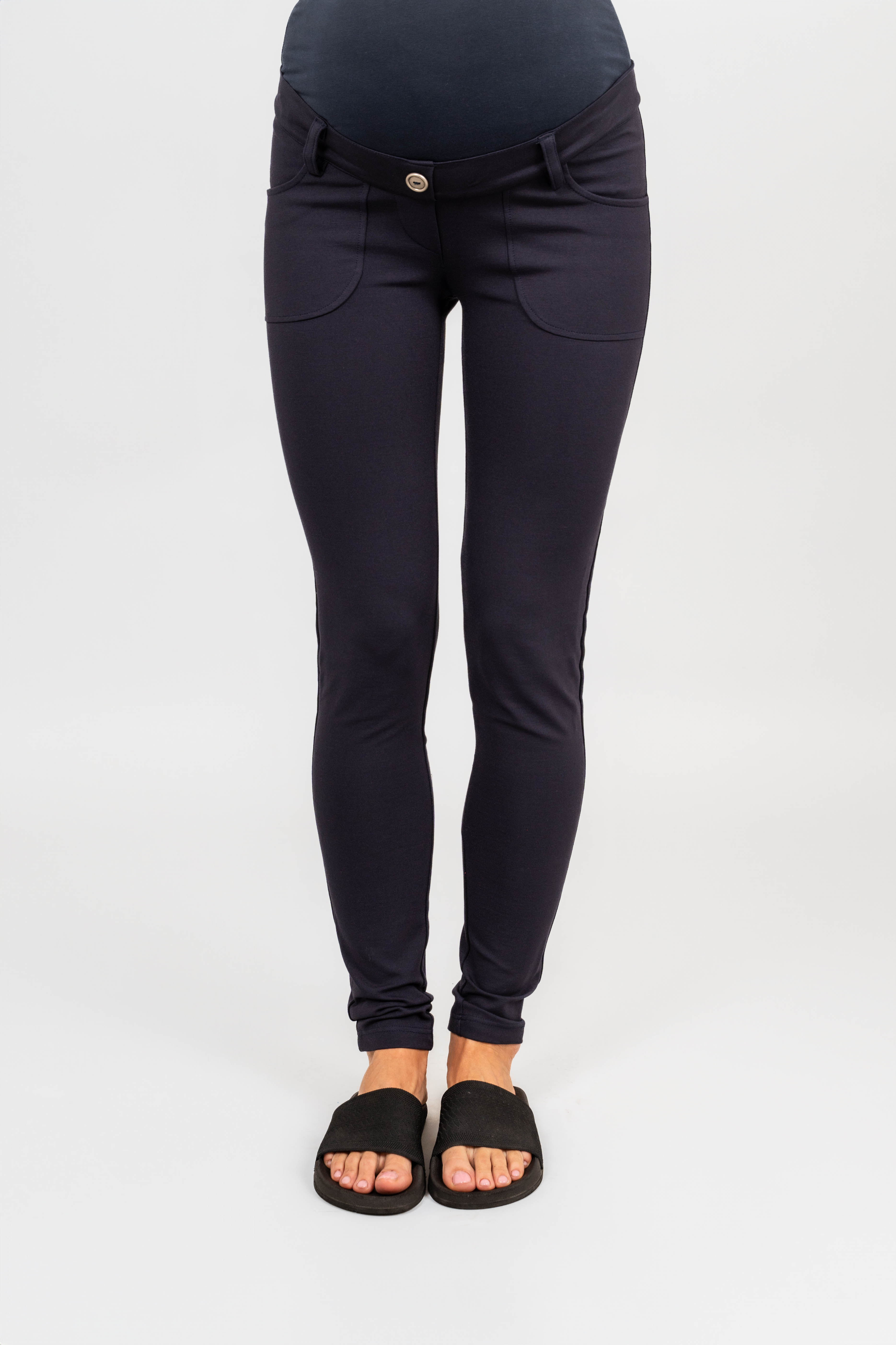 Kicsit vastagabb, punto anyagból készült, elöl zsebes, kényelmes, szűk kismama nadrág, kényelmes pocakrésszel