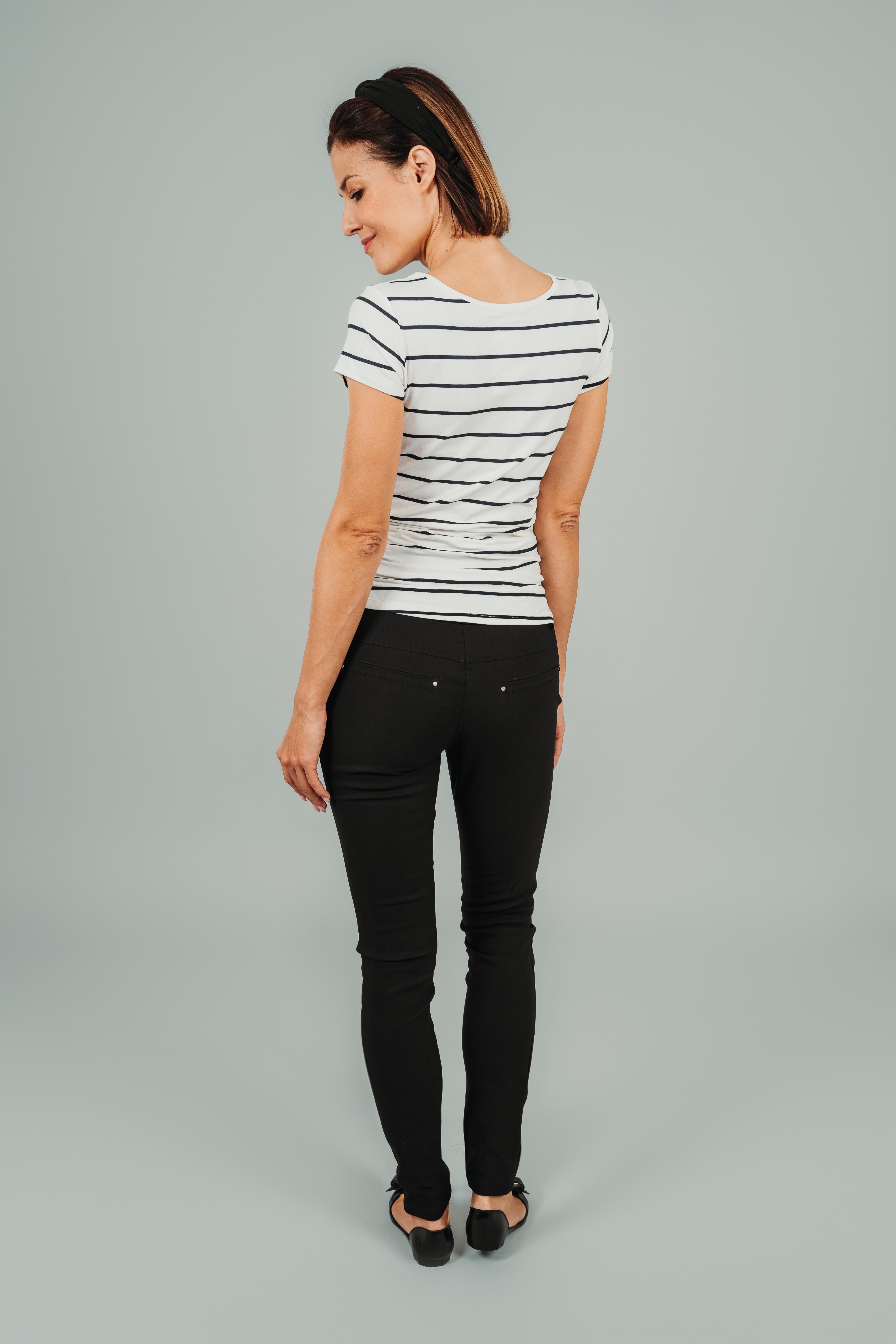 Oldalt húzott kismama felső rövid ujjú fehér alapon kék csíkos