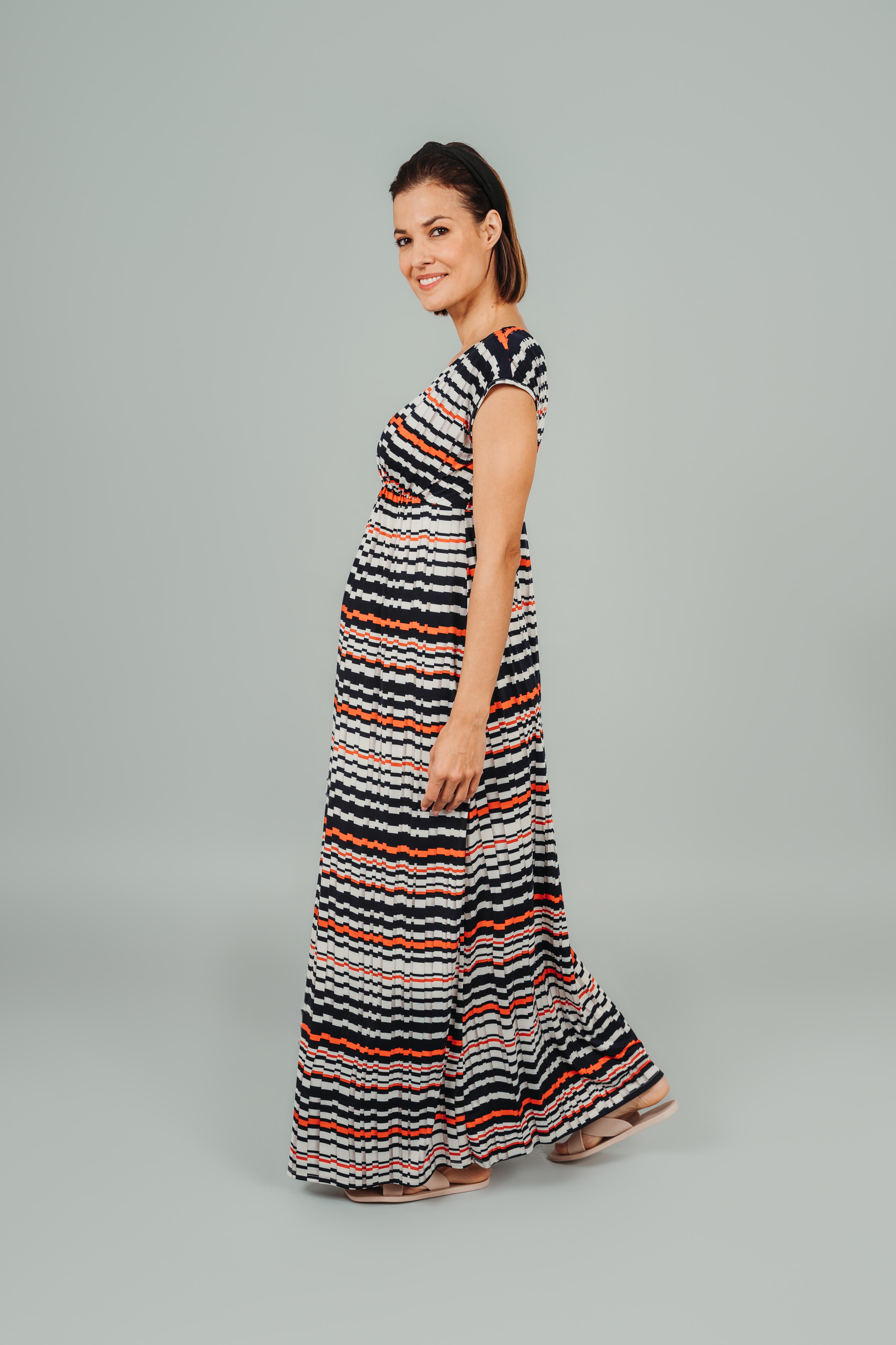 Elegáns, hosszú, mell alatt húzott kismama ruha. Mintájának és színösszetételének köszönhetően feltűnő megjelenést nyújt.kiválóan alkalmas szoptatáshoz is.